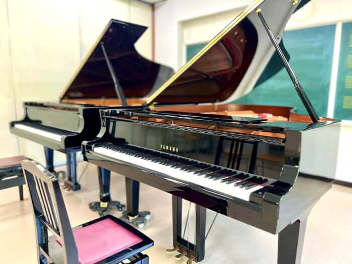 グランドピアノが2台設置されたHR教室やレッスン室、アップライトピアノが置かれた個人練習室など、音を気にせず思い切り練習できる環境があります。